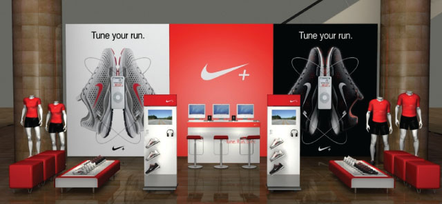 iPods and shoes! This project is nearly 20 years old and was the first branded partnership project of what would become many. Collaboration with architecture and 3D animation teams to apply the Nike brand team’s visual center to key retail accounts using the “Attract, Engage, Connect” retail strategy.